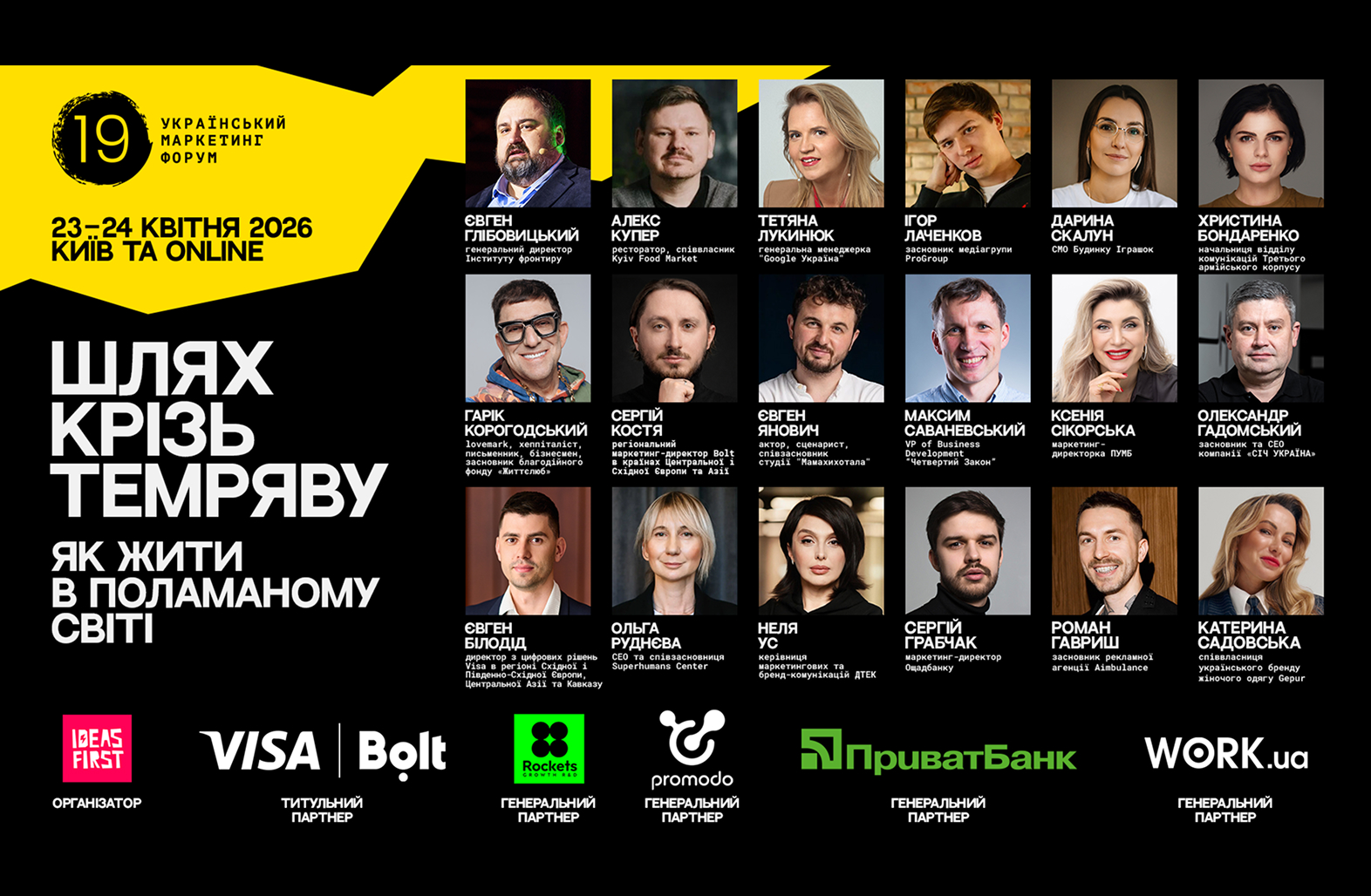 23–24 квітня у Києві та онлайн відбудеться 19-й Український маркетинг-форум — головна щорічна подія у сфері маркетингу та комунікацій. Цього року форум проходить під гаслом «Світ поламаний. Але не ми». Учасники будуть говорити про те, якою може стати нова формула конкурентоспроможності, коли звичні моделі та правила не діють, та що це означатиме для українських компаній у наступні десятиліття.